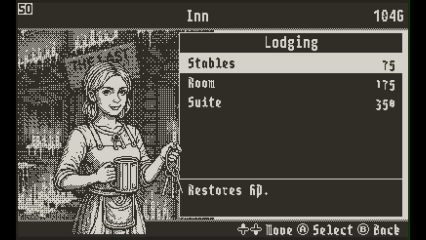 The Playdate has a 400x240 pixel screen. This fairly limited screen real-estate means that many modern UI designs are simply intractable. This means one has to compromise and/or break up UI into multi-part flows simply because the information won't necessarily easily fit on the screen. I say all this because I went through several iterations of the town UI this week before finally deciding to break things into two separate flows for what I call "Services", these are purchasable things from the Inn or Chapel that are applied immediately to character. There is also a separate flow for "Shops" in which you purchase things that go into your inventory.