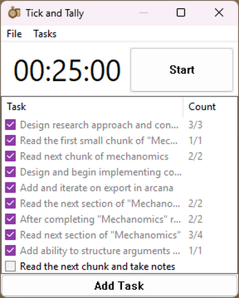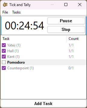 A proper Victorian pomodoro timer with a no-nonsense task ledger. Create simple lists of tasks, then let each session keep you punctual and purposeful. Your tasks are saved as clean, easy-to-read text files, and the always-on-top window ensures the remaining minutes are never out of sight. Dead simple, steadfastly practical.